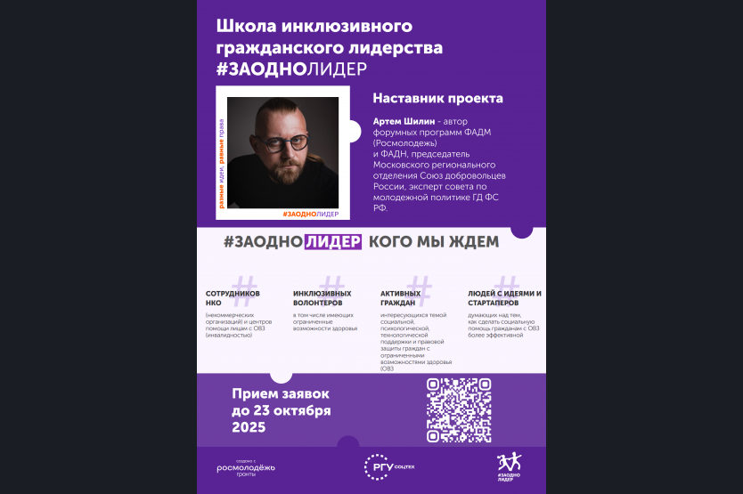 В 2025 году в рамках Всероссийского молодежного движения #ЗАОДНО стартует проект “Школа инклюзивного гражданского лидерства «#ЗАОДНО Лидер”». Его цель — выявление и поддержка молодых гражданских активистов, работающих в сфере инклюзии, а также формирование нового поколения лидеров, способных выстраивать диалог между инклюзивным сообществом и обществом в целом.